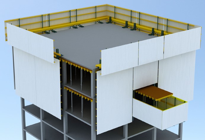 This helps to significantly reduce the use of crane. The entire concrete pouring site is enclosed within the protection which covers 2~4 floors at the same time. This could prevent falling accidents and enhance safety during construction. It has an unloading opening platform which significantly reduce the material and manpower needed and speed up the construction process.